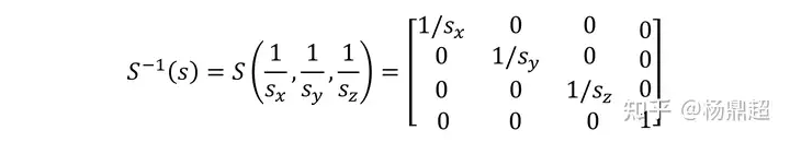 若缩放因子的三个分量相等,则称之为均匀缩放,否则为非均匀缩放。缩放矩阵的逆,就是取缩放因子的倒数: